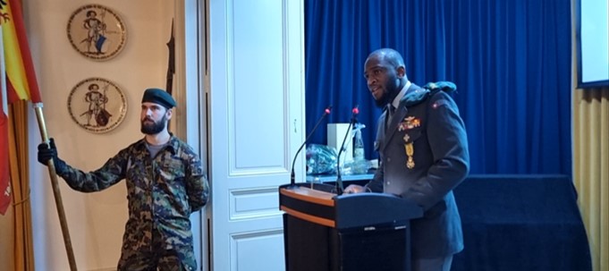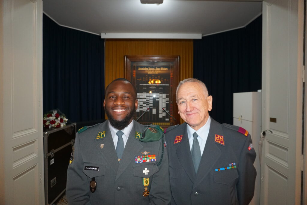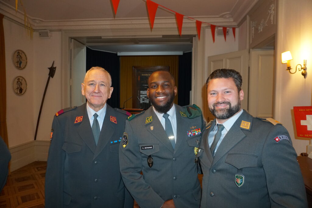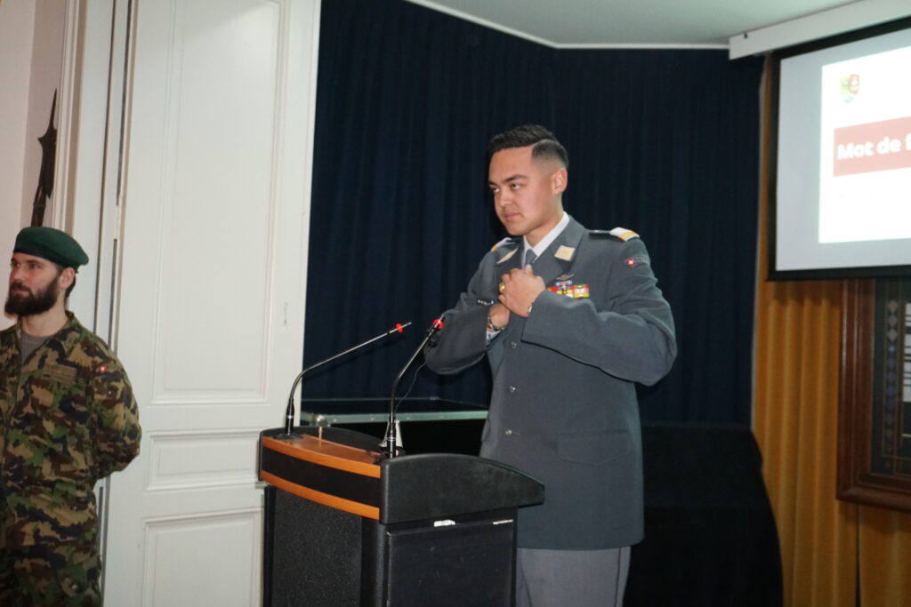 Le salut protocolaire et le discours d’accueil ont ensuite été prononcés par le sergent Kevin Monama, président de l’ASSO Genève. À travers son allocution, le président a rappelé le rôle fondamental de l’ASSO comme espace de rencontre, de transmission et de continuité hors du service, inscrit dans la tradition de la milice suisse. Il a souligné l’importance du lien intergénérationnel, de la formation hors service, de la camaraderie et de l’engagement volontaire au service de la collectivité. Son intervention a également mis en lumière la signification particulière de l’année écoulée, marquée par la commémoration du 150ᵉ anniversaire de la mort du général Guillaume-Henri Dufour, figure fondatrice de la section genevoise.