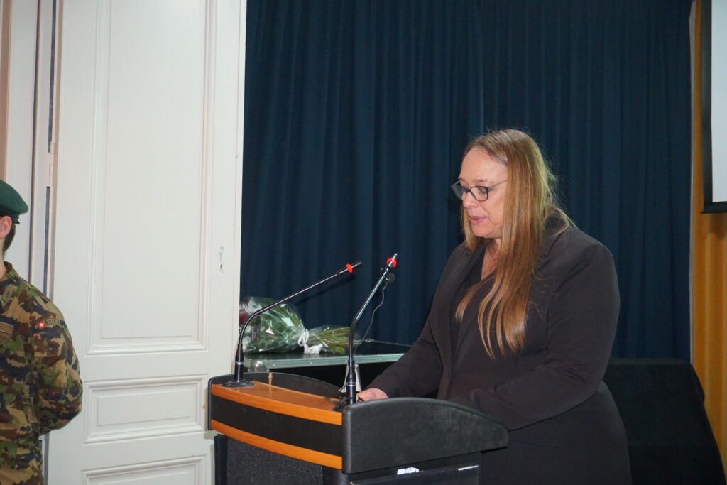 Madame Carole-Anne Kast, Conseillère d’État en charge du Département des institutions et du numérique, est ensuite intervenue au nom des autorités cantonales. Elle a mis en avant le rôle de l’ASSO dans le paysage des associations militaires, son importance pour la transmission des valeurs de la milice et son apport à la culture de sécurité et d’engagement citoyen.